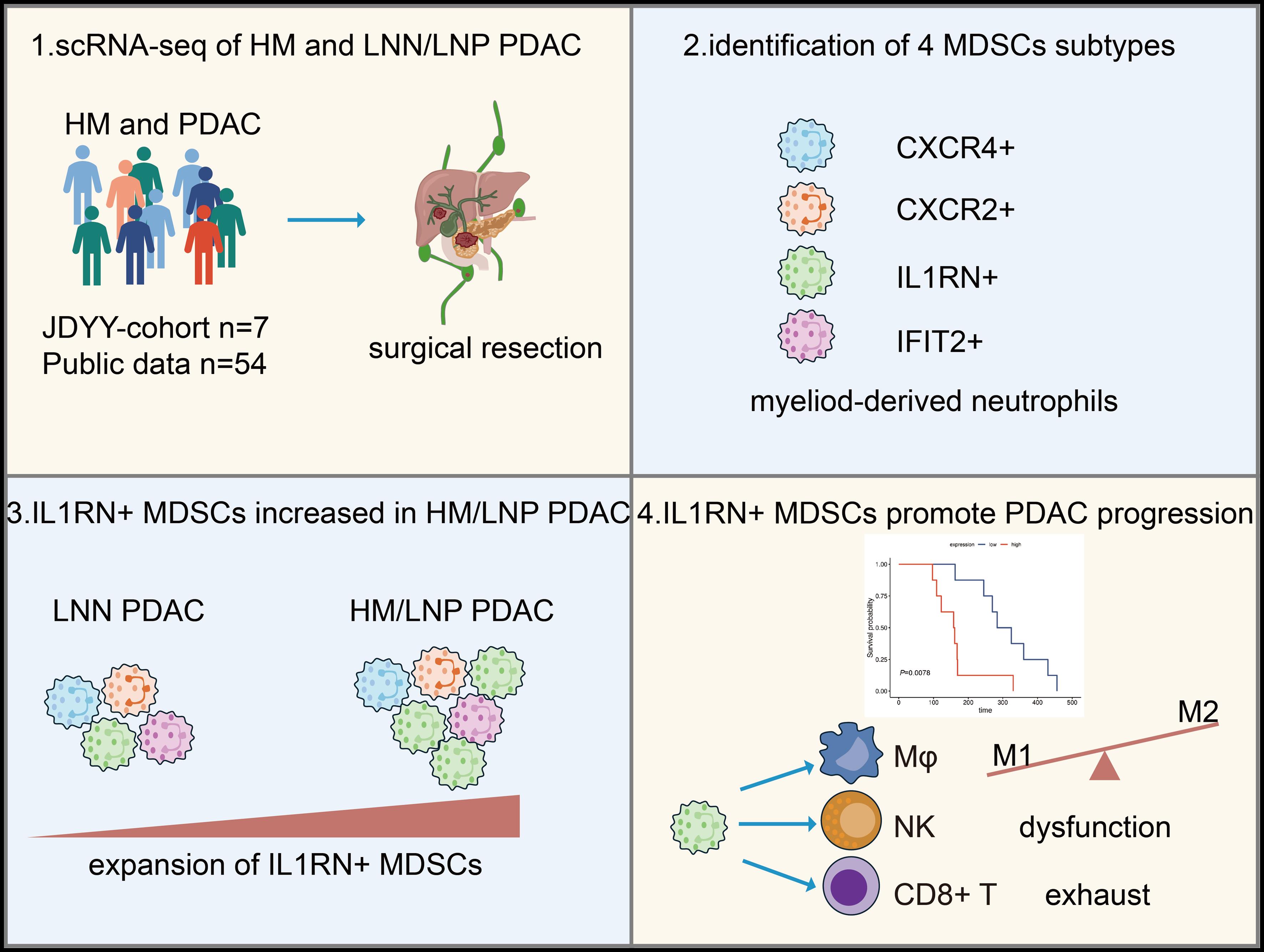 IL1RA+ MDSCs have been identified as novel regulatory immune cells that are significantly enriched in the HM and LNP PDAC microenvironment and are associated with poor prognosis. This study confirmed that IL1RA+ MDSCs express high levels of IL1RA and VEGFA and interact with NK cells, T cells, and macrophages to establish an immunosuppressive microenvironment via the IL1 pathway. Furthermore, IL1RA+ MDSCs promote PDAC progression through the VEGF pathway in both in vitro and in vivo models. These findings highlight the potential of targeting IL1RA+ MDSCs in the TME as a promising therapeutic strategy for PDAC.