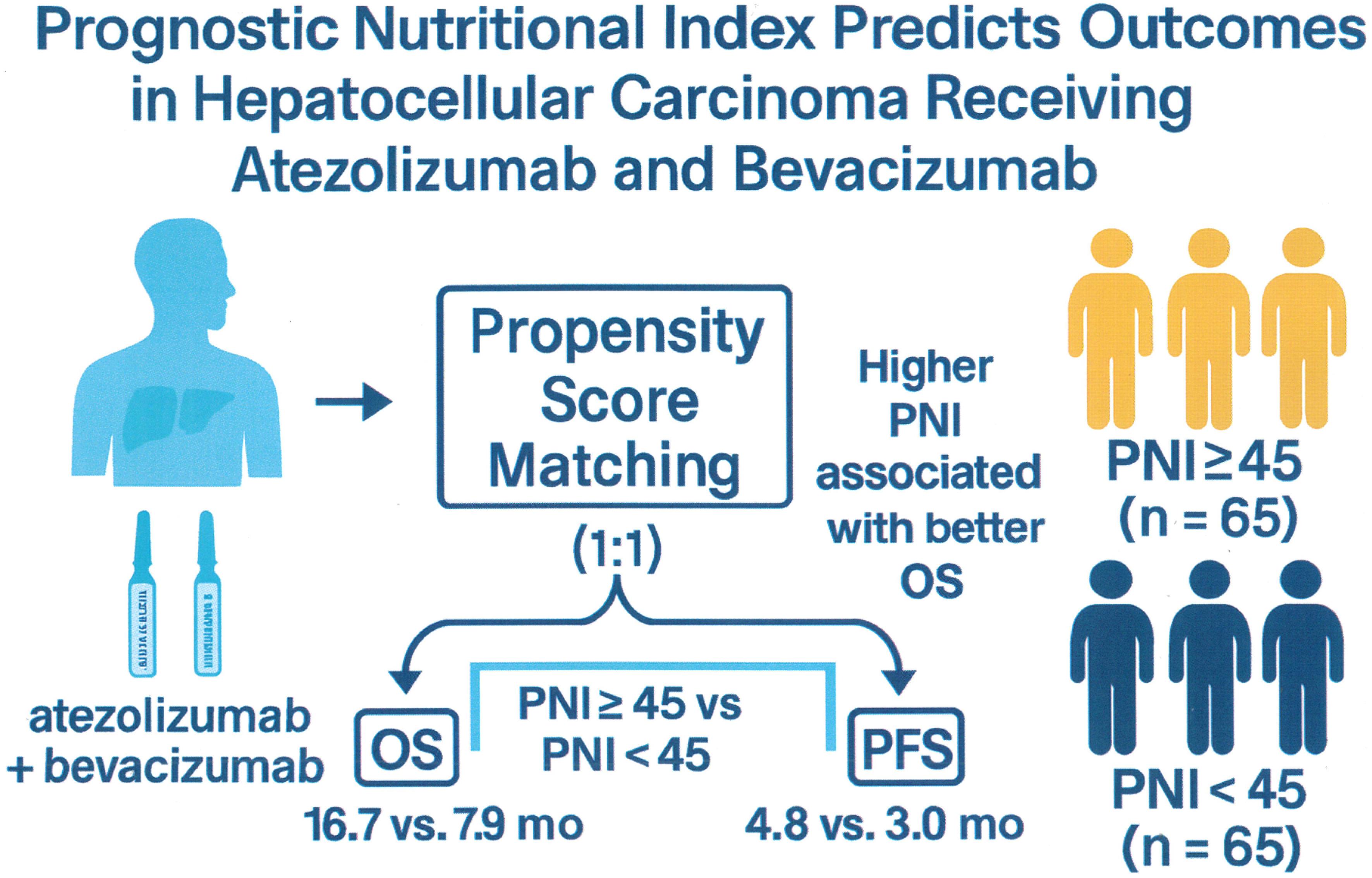This study is the first to highlight the prognostic role of the PNI in patients with unresectable HCC treated with Ate/Bev, using a rigorous and comprehensive PSM approach. The strong prognostic value of PNI demonstrated here underscores the critical influence of nutritional and inflammatory status on cancer treatment outcomes. PNI, which combines serum albumin levels and lymphocyte counts, reflects both nutritional health and systemic immune status. Serum albumin functions not only as a marker of nutritional status but also as an indicator of systemic catabolism and inflammation. Hypoalbuminemia is associated with increased catabolic activity, diminished hepatic protein synthesis, and poor physiologic reserve, all of which may negatively impact treatment response and drug metabolism.18 Lymphocyte count, another key element of PNI, reflects the host’s adaptive immune competence, particularly the activity of cytotoxic T cells, which are central to the efficacy of ICIs targeting programmed cell death-1/programmed death-ligand 1 pathways.19 A reduced lymphocyte population may therefore signify an immunosuppressed tumor microenvironment and attenuated anti-tumor immune responses, potentially explaining the poorer ORRs observed in low-PNI patients.20 These observations suggest that low PNI reflects not only malnutrition but also an immunologically compromised and pro-inflammatory state that is less conducive to successful immunotherapy.