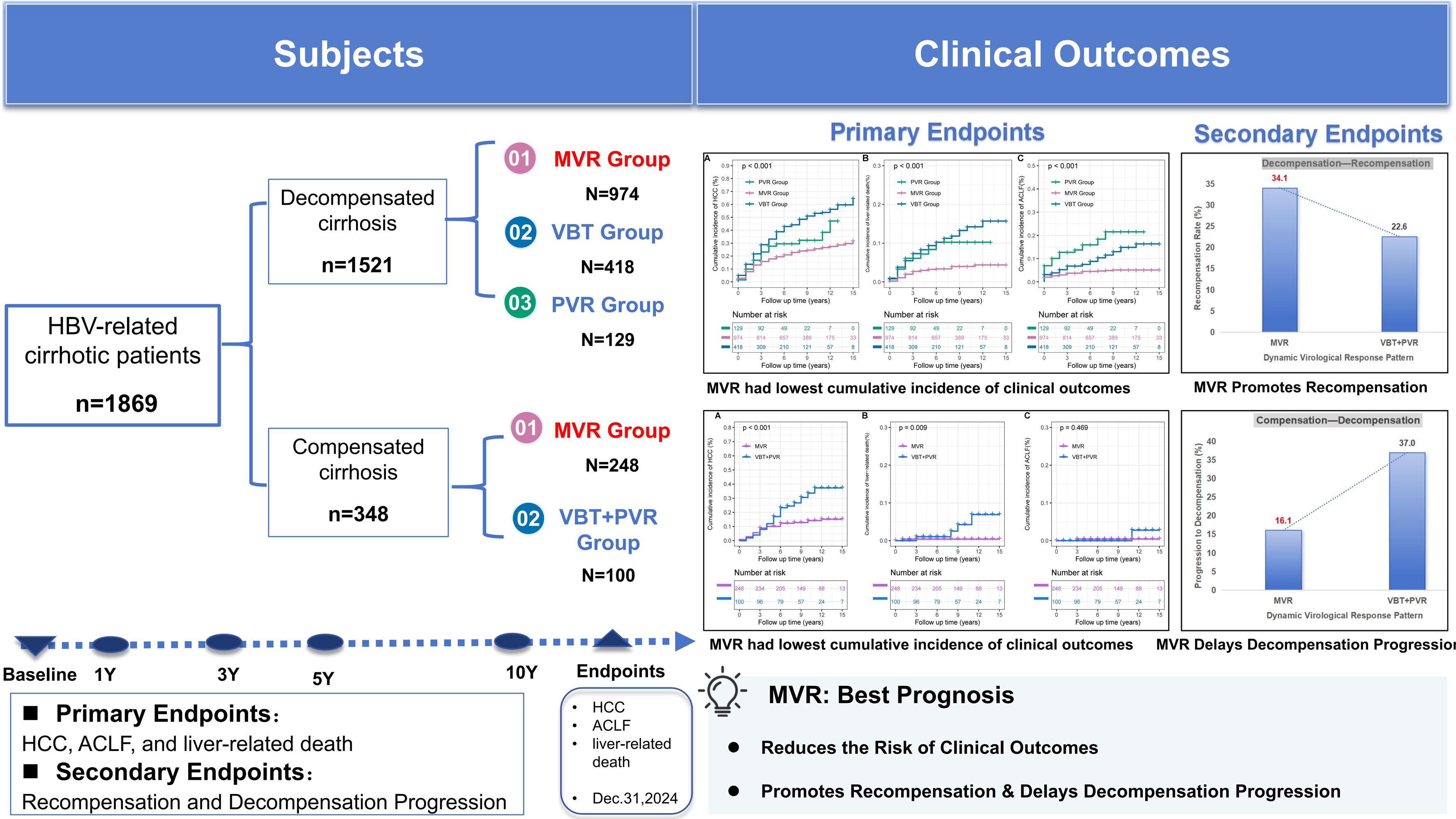 This large, real-world, 10-year cohort study demonstrated that MVR to NA therapy is strongly associated with a lower incidence of HCC and liver-related death and higher recompensation rates in patients with HBV-related cirrhosis. These findings collectively emphasize the critical importance of sustained virological suppression and the pursuit of HBV functional cure.