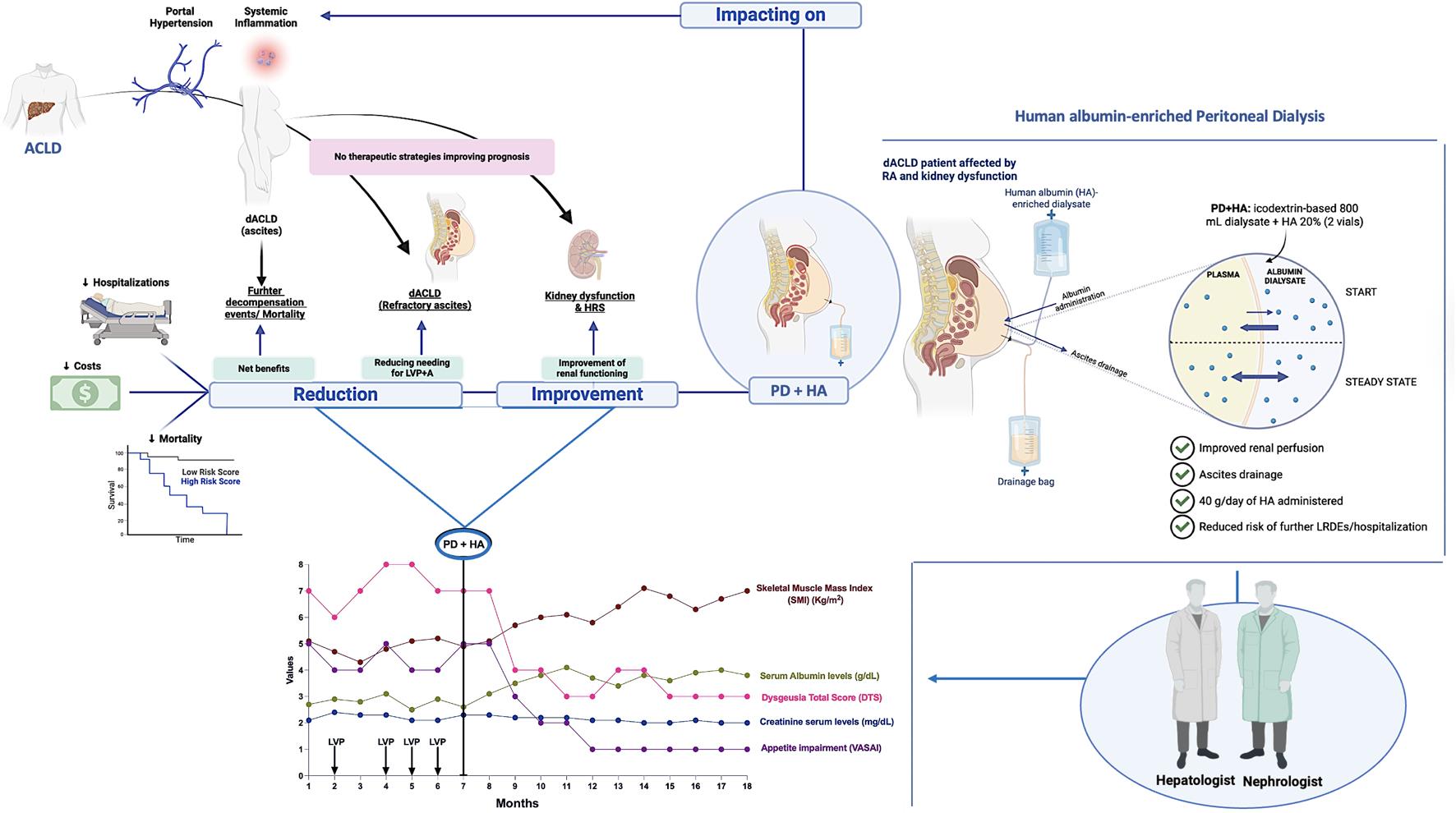 In this scenario, PD emerged as a feasible and effective strategy, enabling gradual ascitic fluid removal and progressive renal recovery, thus permitting discharge with the indication to continue i.v. HA administration. Indeed, hypoalbuminemia has been revealed as a predictor of mortality in CKD-affected patients and an independent risk factor for peritonitis in PD.9 On the hepatologic side, HA administration represents a cornerstone in the therapeutic management of dACLD patients, representing, de facto, a disease-modifying drug.6 In this sense, long-term HA therapy has been demonstrated to improve survival rates, reduce complication rates, and overall contribute to a more favorable prognosis in dACLD.4,6 However, these benefits have been documented exclusively with i.v. HA administration, which may pose logistical challenges, including limited peripheral venous access, infusion-related phlebitis, and the requirement for close monitoring. Nevertheless, PD is not commonly used due to concerns about excessive albumin loss and the perception of an increased risk of peritonitis and malnutrition, potentially leading to worse patient outcomes.8,9 However, by enriching the dialysate with an appropriate dose of albumin, it is possible to reverse the concentration gradient, enabling the use of the peritoneum as a route for albumin administration.