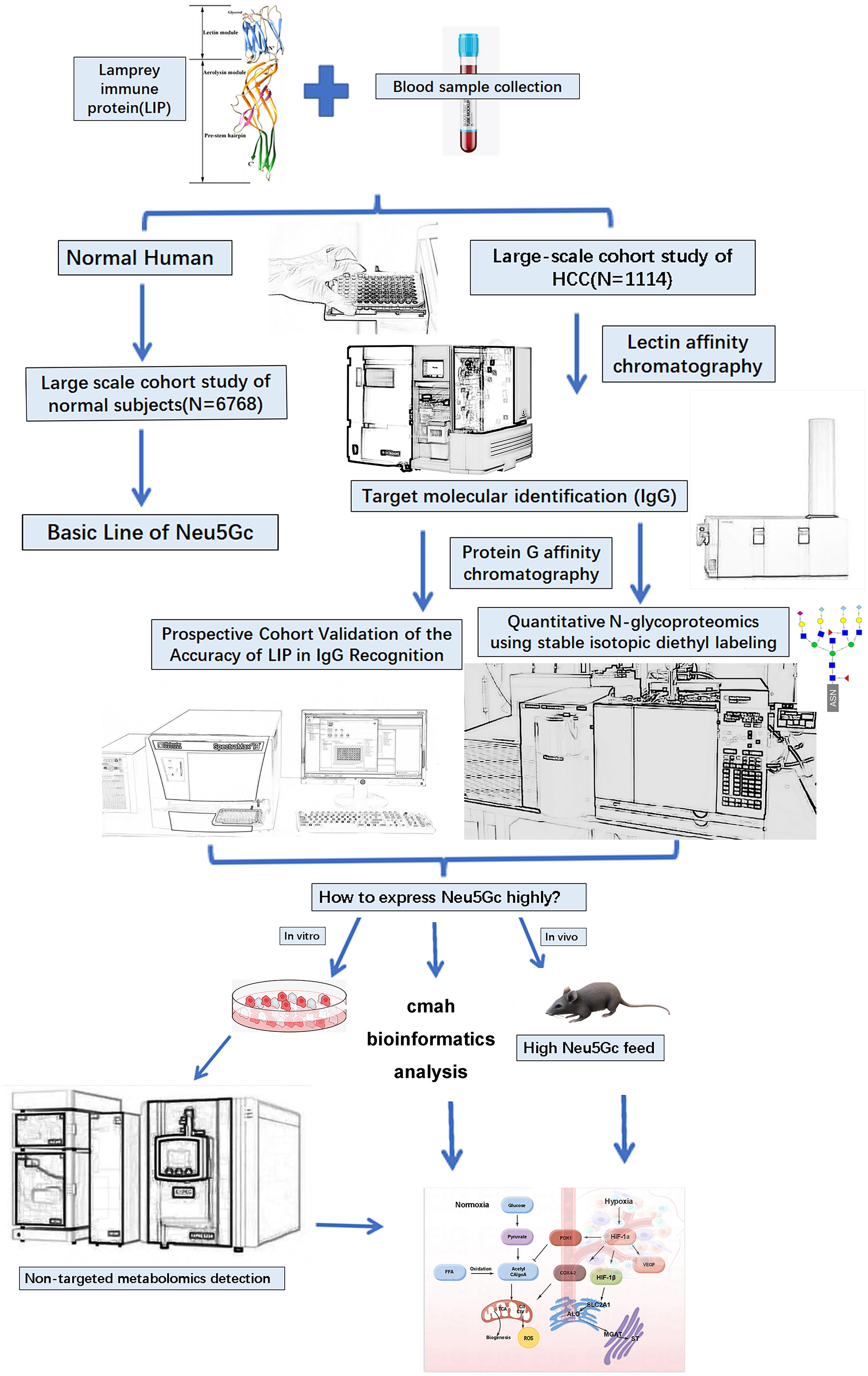 However, as a pioneering effort, our study has certain limitations in terms of the experimental design and detection technology. In this study, glycan analysis was performed on a single protein in the serum. Although IgG is a highly abundant protein, it cannot fully represent the glycosylation profile of the total serum proteins. Additionally, the follow-up cohort in this study was a dynamic cohort with a duration of more than 10 years. However, this was presented in a cross-sectional manner in this study, failing to reflect the dynamic advantages of the cohort. Further stratified analysis was not performed to establish a clinical prediction model. Additionally, the mechanistic research was not sufficiently deep, and the integration of mouse and cell experiments was insufficient. The evidence presented here lacks direct intuitiveness, emphasizing the need for further validation of this pathway. To address this, we aimed to establish a metabolic flow detection platform focusing on sialic acids Neu5Ac and Neu5Gc to enhance the clarity of our findings. Future studies will integrate multi-omics data and longitudinal cohort analysis to develop a clinically applicable Neu5Gc-based diagnostic model for HCC, addressing current limitations and translating our findings into clinical practice.