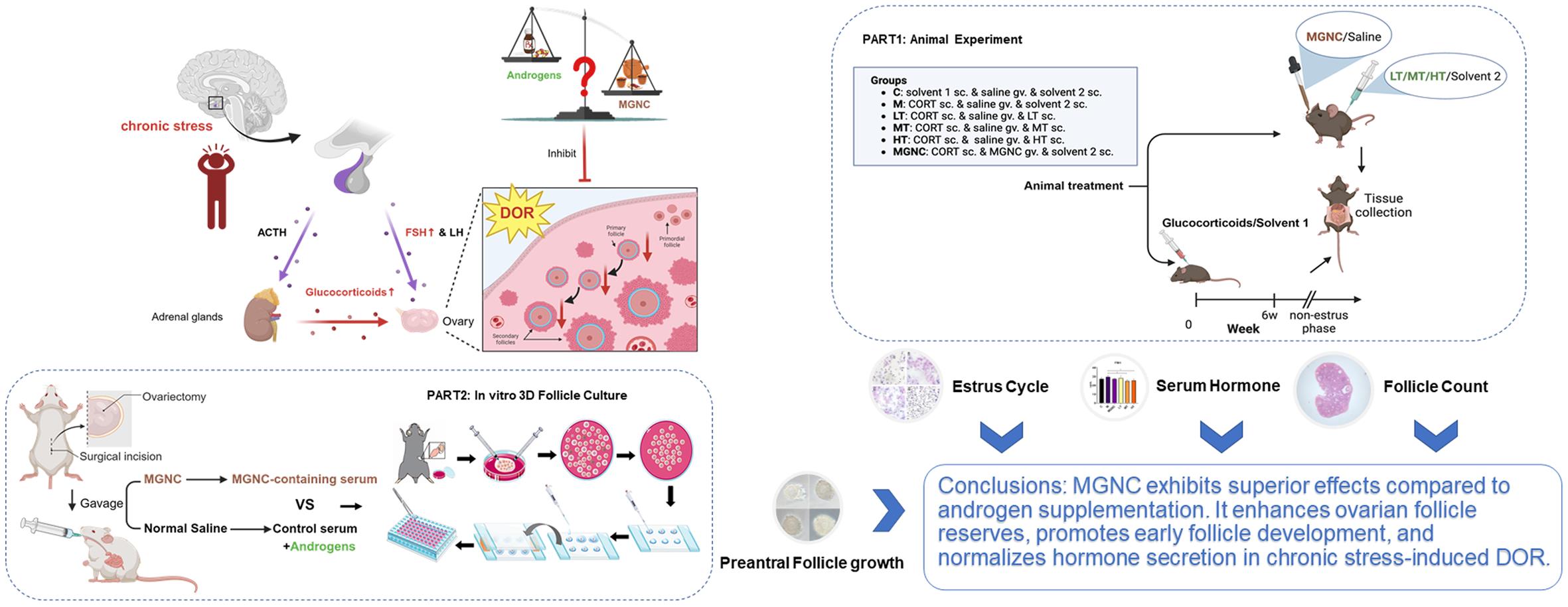 This study aimed to compare the effects of different doses of androgen and MGNC in a glucocorticoid-induced chronic stress animal model and an in vitro follicle growth model to clarify the potential therapeutic advantages of MGNC.