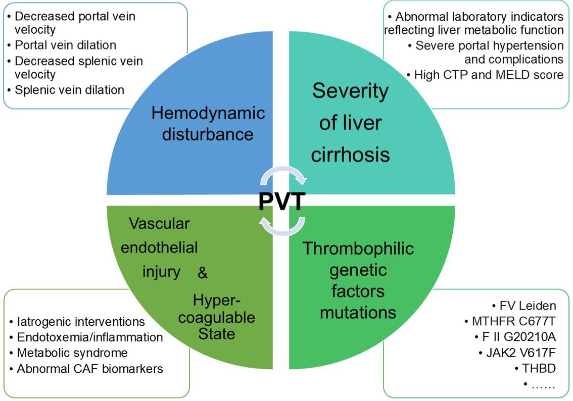 PVT is a complication of LC, and thus, the severity of LC is likely one of the risk factors for PVT. The severity of LC can be reflected by the degree of PH, laboratory indicators related to hepatic metabolic function, and liver function scoring models.