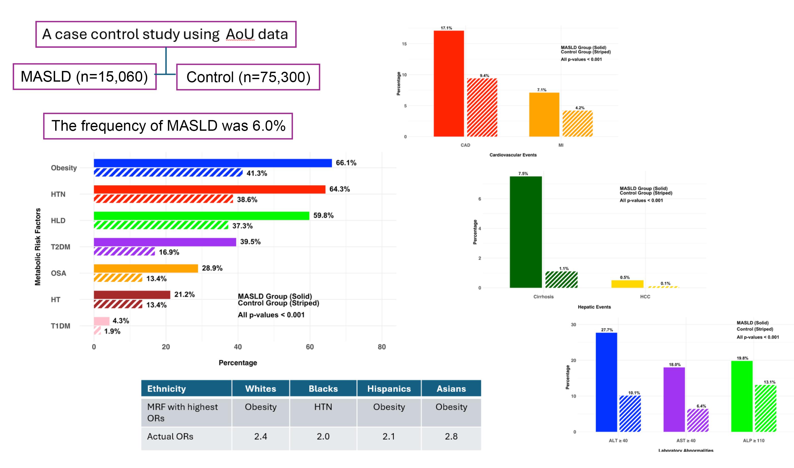 The characteristics of interest in this study were age (i.e., age at initial diagnosis of MASLD for cases and age at the latest EHR data available for the controls), assigned sex at birth (i.e., female, male, other/unknown), self-reported race and ethnicity (i.e., White, Black, Hispanic or Latino, Asian, and other/unknown), country of birth (i.e., USA vs. non-USA), MRFs (i.e., obesity by average BMI with a threshold of 25 for Asians and a threshold of 30 for non-Asians35–37), T2DM (SNOMED code: 44054006), HLD (SNOMED code: 55822004), HTN (SNOMED code: 38341003), OSA (SNOMED code: 78275009), HT (SNOMED code: 40930008), T1DM (SNOMED code: 46635009), cardiac events [i.e., CAD (SNOMED code: 53741008) and MI (SNOMED code: 22298006)], and hepatic events [i.e., cirrhosis (SNOMED code: 19943007) and HCC (SNOMED code: 109841003)]. Additionally, liver injury-related laboratory data, including ALT, AST, and ALP, were also available and collected in a small portion (as detailed in the RESULTS section) in both groups. All the above-mentioned variables were considered if their diagnosis occurred before, at the same time, or up to a maximum of three months after the diagnosis of MASLD. For BMI, due to data availability, we used the average value of data points in the participants’ EHR data.