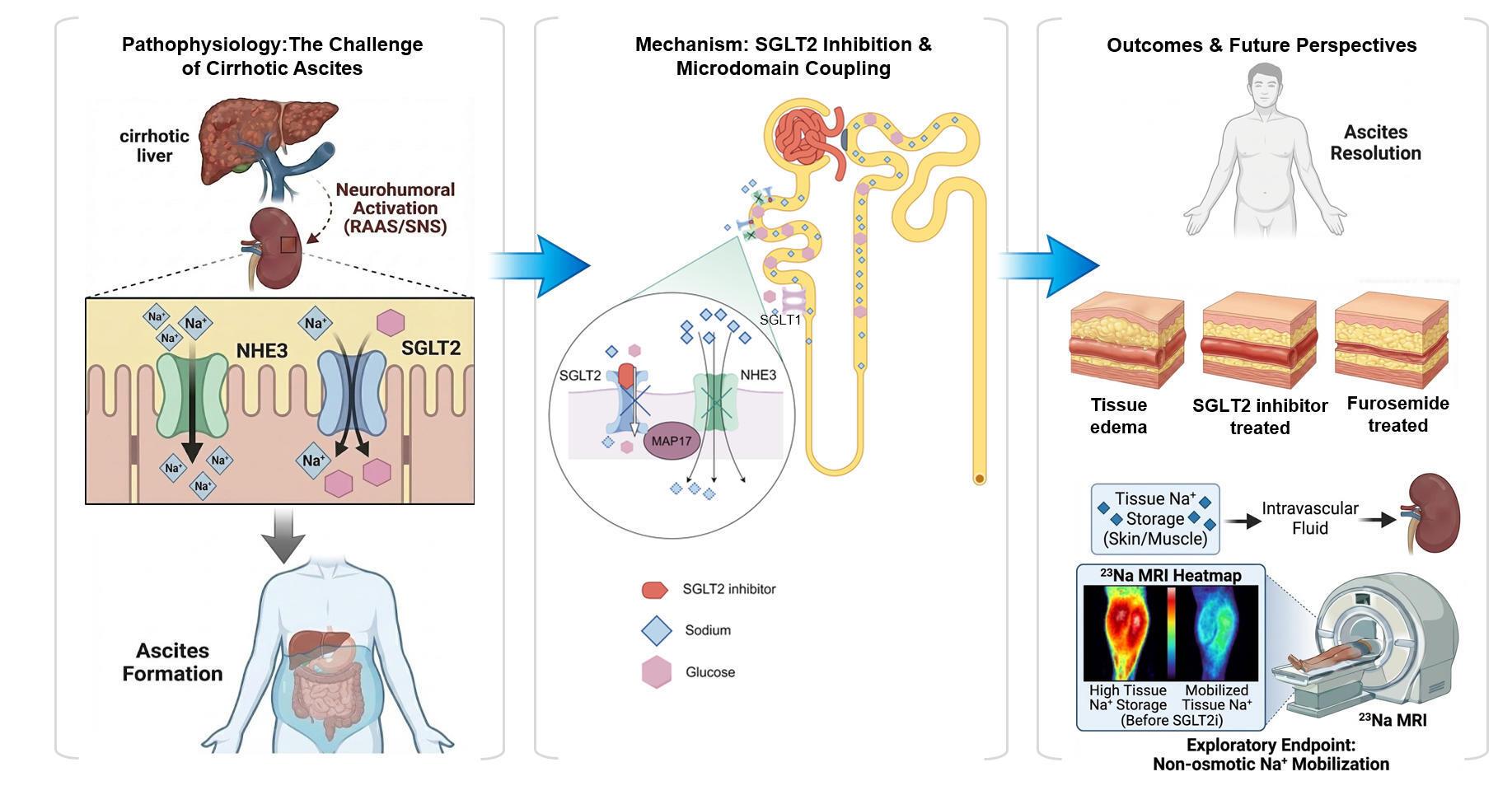 SGLT2 inhibitors attenuate proximal tubular sodium reabsorption through a proximal microdomain comprising SGLT2, MAP17, and NHE3. Downstream effects include modulation of the RAAS and sympathetic nervous system, potentially redistributing tissue sodium. These mechanisms directly address the low distal sodium delivery that underlies diuretic resistance in cirrhotic ascites. Early clinical observations indicate promising effects on natriuresis and reductions in ascites burden, with a safety profile consistent with experience from other trials involving SGLT2 inhibitors. Although the current evidence remains preliminary and limited, a coherent translational pathway from “mechanistic rationality” to “clinical feasibility” has been initially established, providing a solid basis for subsequent high-quality clinical validation.