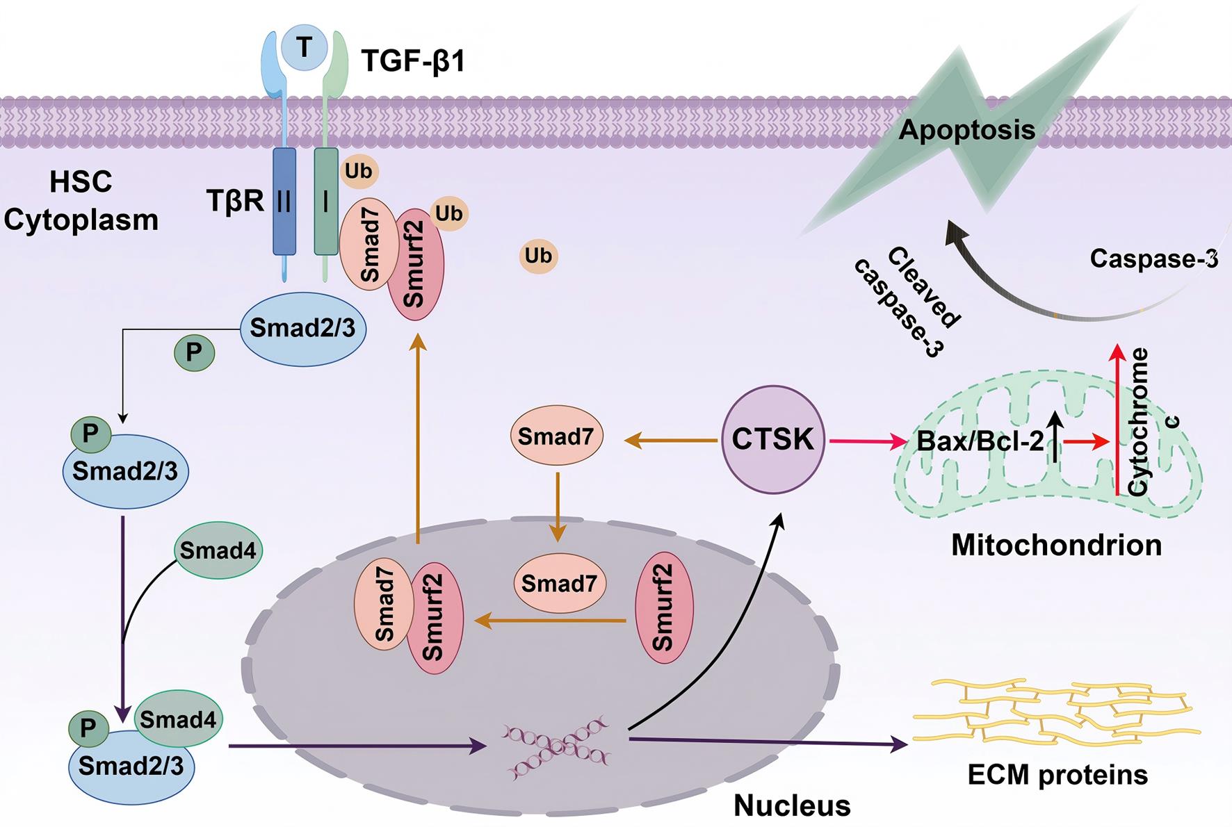 The persistence of fibrosis following chronic liver injury suggests that the endogenous protective response from upregulated CTSK is insufficient to suppress the pathological process. Critically, in two distinct mouse models of liver fibrosis, we demonstrated that exogenous CTSK overexpression exerted significant anti-fibrotic effects. These effects were primarily mediated through two mechanisms: suppressing the TGF-β/Smad signaling pathway and inducing HSC mitochondrial apoptosis. Together, these results provide a theoretical basis for targeting CTSK as a potential therapeutic strategy for liver fibrosis.