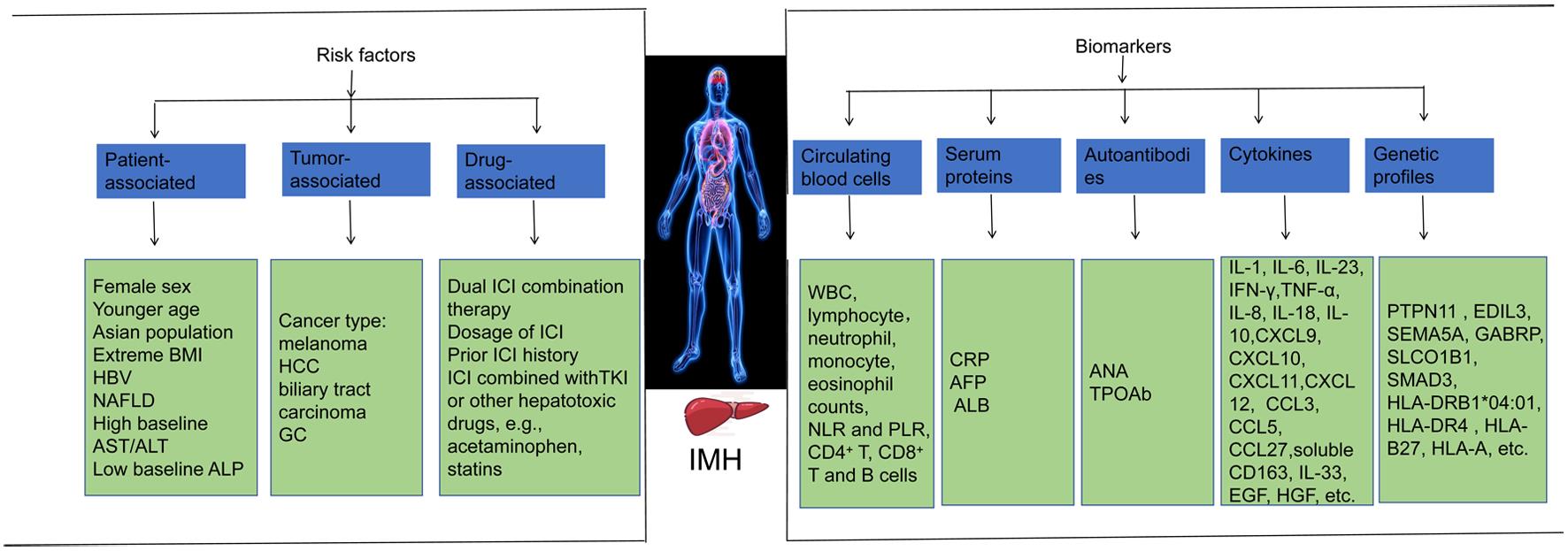 Evidence suggests that several clinical risk factors, such as female sex, pre-existing non-alcoholic fatty liver disease (NAFLD), and the use of combination ICIs (e.g., anti-CTLA-4 plus anti-PD-1/PD-L1), are associated with an elevated risk of IMH, which allows for early identification of high-risk populations.20–22 Concurrently, emerging investigations into potential biomarkers, including circulating blood cells, autoantibodies, cytokines, specific immune cell subsets (e.g., CD8+ T cells), and genomic signatures, have demonstrated promise for risk stratification and early intervention of irAEs, suggesting their potential as markers for IMH prediction.23,24 However, the available evidence on the risk factors and biomarkers that predict IMH occurrence remains limited, and most studies are retrospective, not specifically focused on IMH. Therefore, this review aims to comprehensively synthesize the current landscape of the risk factors and emerging biomarkers associated with IMH during ICI therapy, which will provide promise for early identification and individualized management of IMH, thereby promoting the safety and efficacy of tumor immunotherapy.