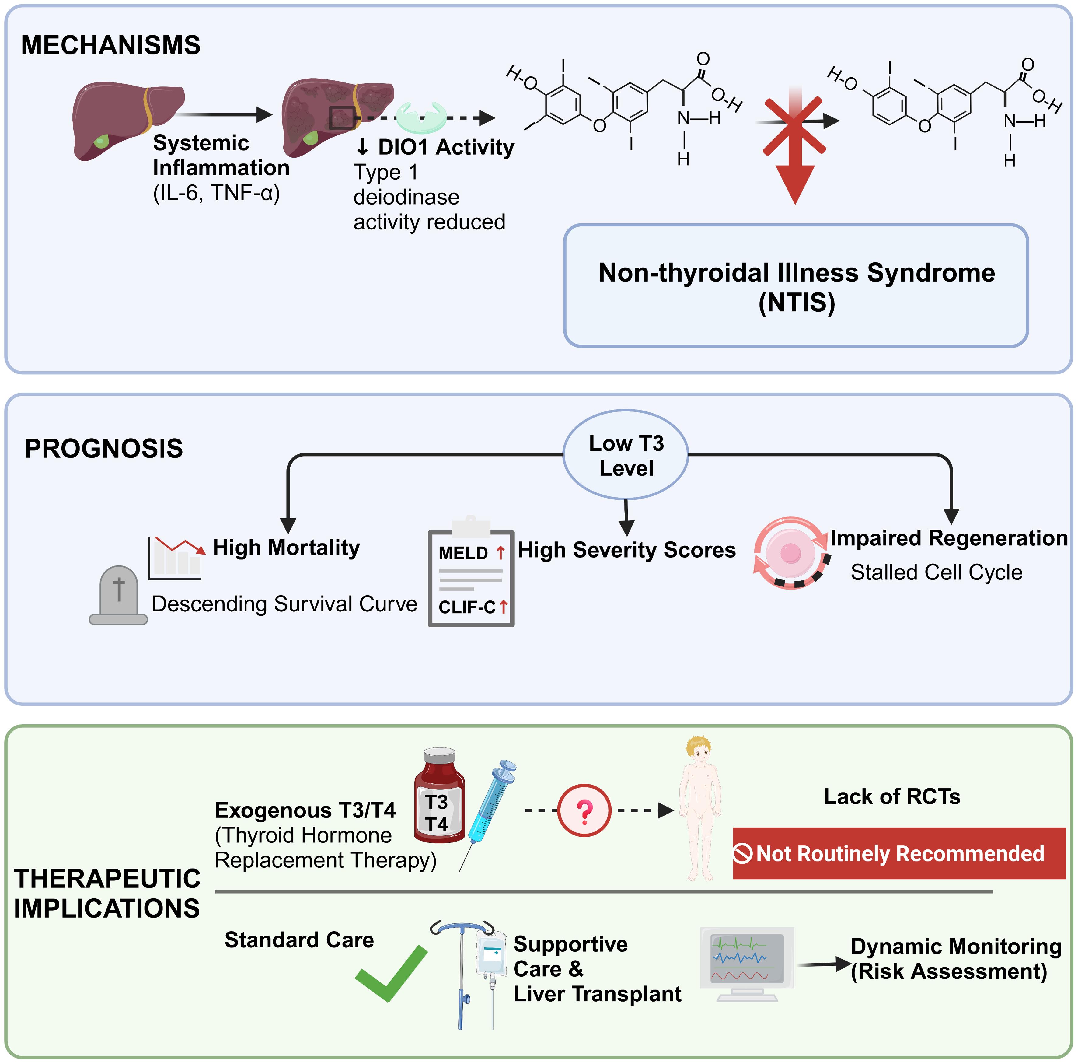 Fundamentally, T3 acts as a critical regulator of liver regeneration. Consequently, a decline in T3 levels marks the onset of NTIS, serving as a critical indicator of metabolic dysfunction and an independent predictor of mortality risk in ACLF.