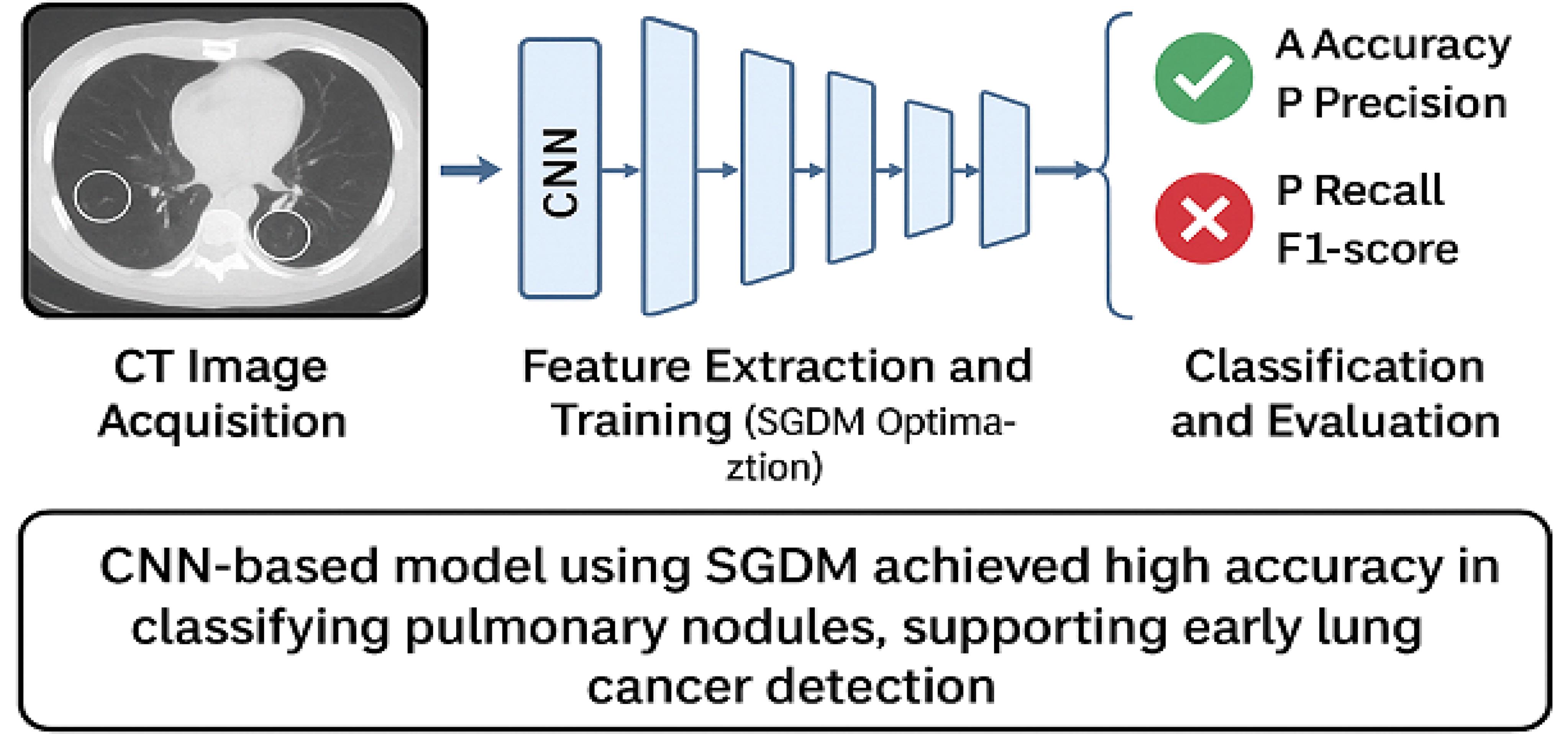 This study developed and validated a CNN–based system for the automatic detection and classification of pulmonary nodules using the LIDC-IDRI dataset. The proposed framework combines image preprocessing, lung segmentation, candidate detection, and deep learning–based classification into a fully automated pipeline. The model achieved strong performance, with 98.7% sensitivity, 97.5% specificity, 97.9% precision, 98.4% accuracy, an F1-score of 98.2%, and an MCC of 0.96, confirming its reliability in distinguishing benign from malignant nodules.