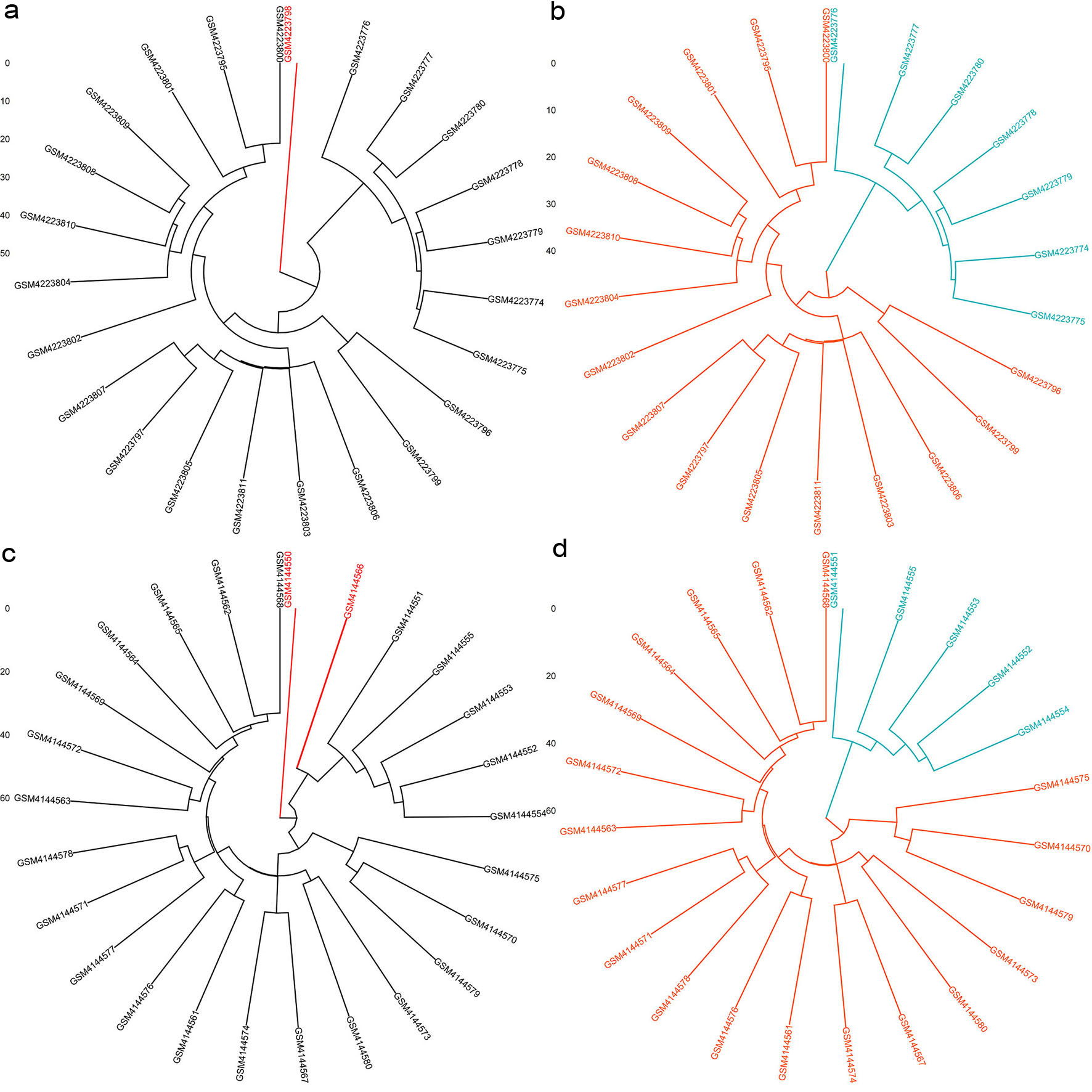 We used the keywords “cirrhosis” and “acute-on-chronic liver failure” to search the Gene Expression Omnibus Database (http://ncbi.nlm.nih.gov/geo ) for gene expression datasets related to LC and ACLF. We obtained gene expression profiles from the GSE142256 database (GPL17586), which includes 14 LC, 17 ACLF, and seven control samples. Similarly, we retrieved data from GSE139602 (GPL13667), comprising 20 LC, eight ACLF, and six healthy samples. Based on a phylogenetic tree analysis, we identified three samples with abnormal clustering results, exhibiting low similarity to similar data points and appearing to be mixed into other disease categories. This situation could affect the accuracy of subsequent research findings. Therefore, we decided to exclude the abnormal sample GSM4223798 from the ACLF group, while GSM4144550 and GSM4144566 were excluded from the control and LC groups, respectively. The screening process and its results are detailed in Figure S1a–d. The PERL programming language (version 5.32.1) was used to map probes to gene symbols based on the annotation files provided for the respective platforms.