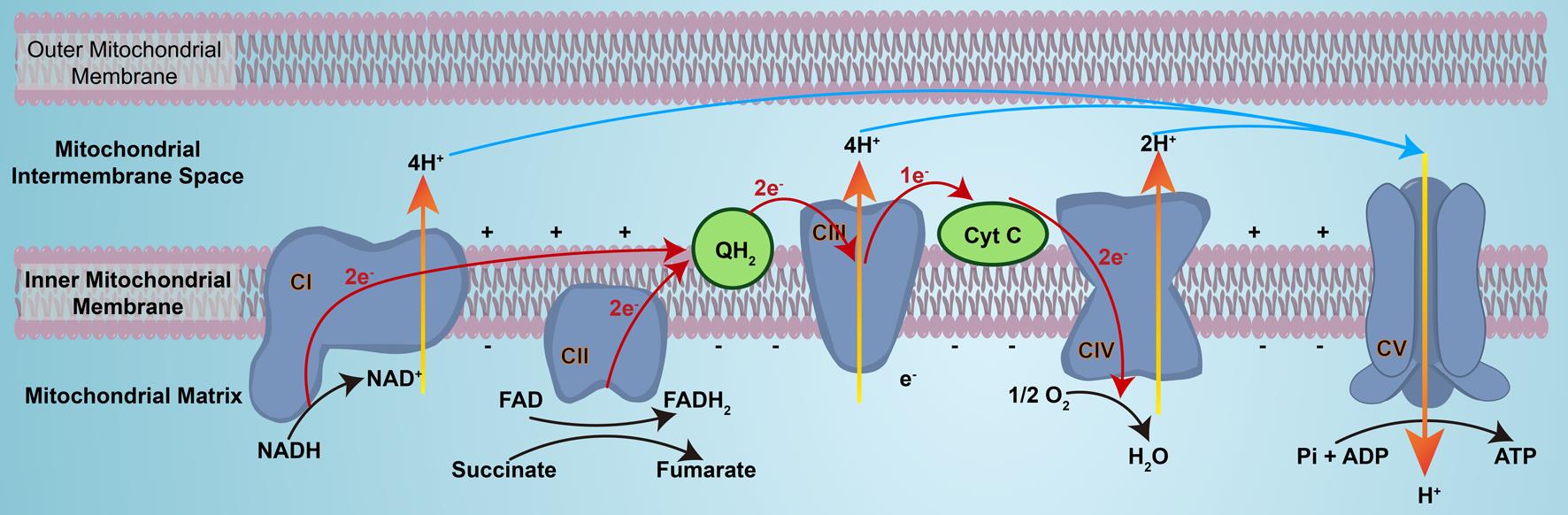 Mitochondrial complexes reside within the inner mitochondrial membrane and comprise five core complexes (I–V). These complexes function synergistically to transfer electrons from nicotinamide adenine dinucleotide (NAD) and flavin adenine dinucleotide (FAD) to oxygen, ultimately producing ATP to meet cellular energy demands. Each complex consists of specific subunits and carries out distinct redox reactions (Table 1).5–27
