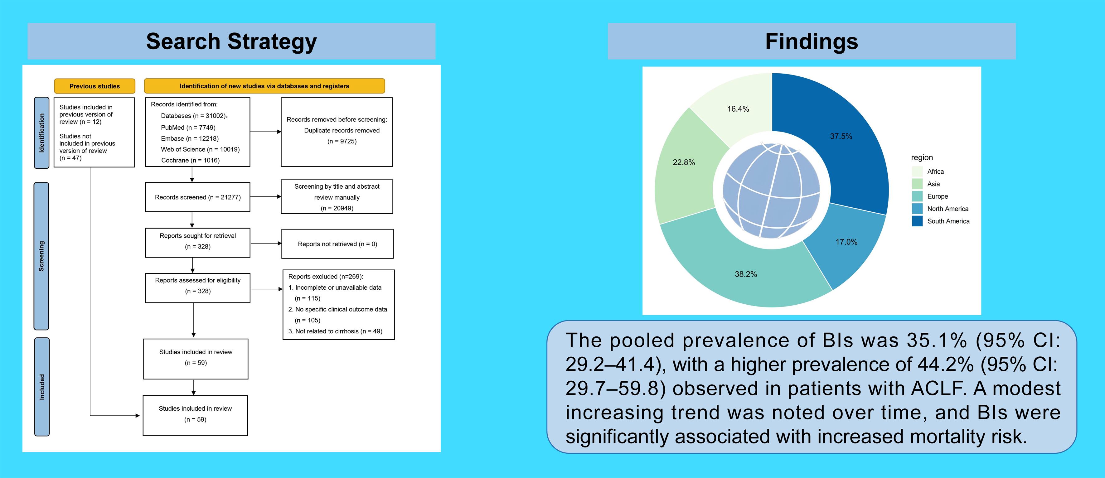 While previous studies have focused on local or regional estimates, global evidence remains fragmented. Here, we conducted a meta-analysis to estimate the global prevalence of BIs in patients with liver cirrhosis, investigate temporal trends using meta-regression, and assess their association with mortality.
