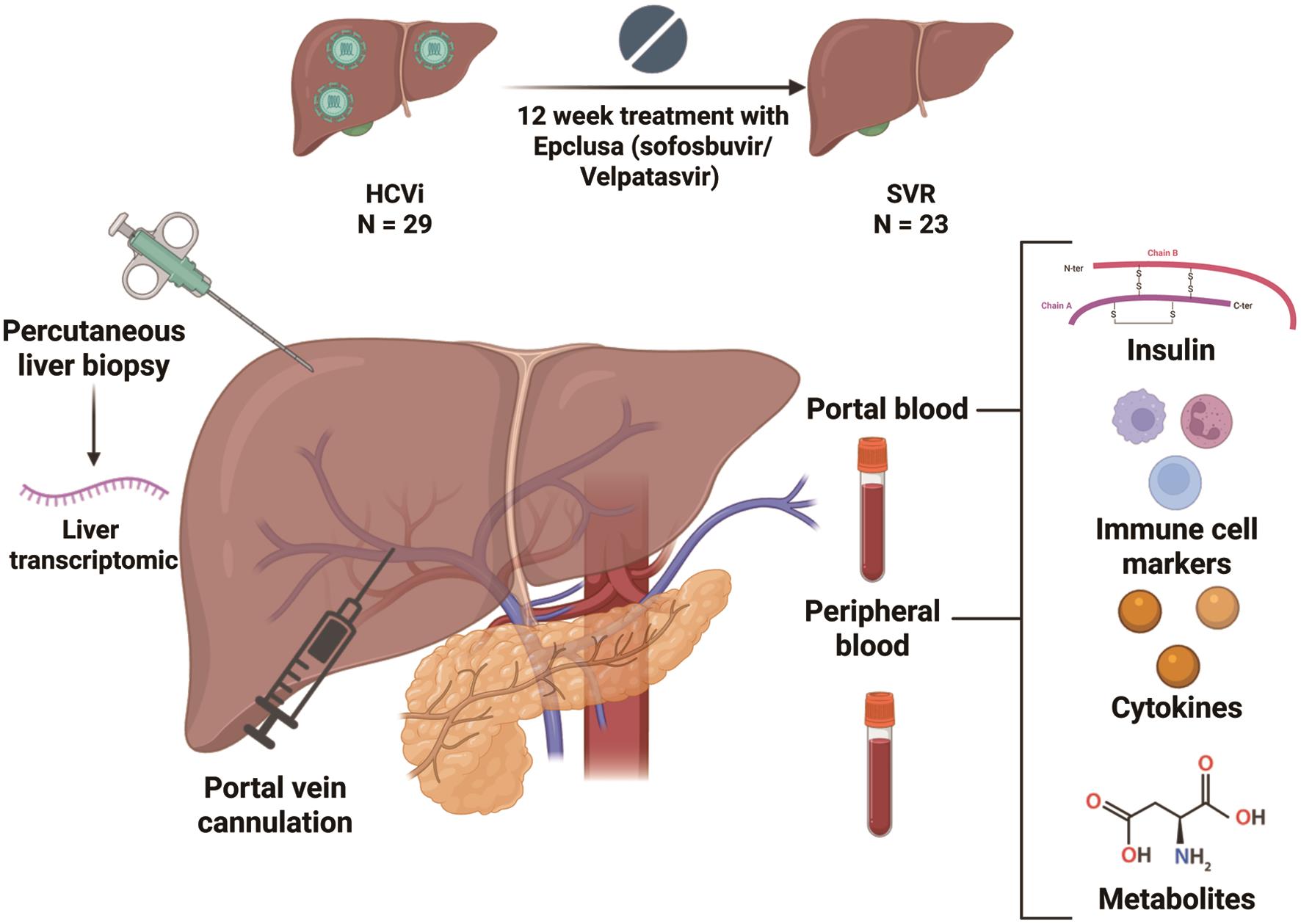 This is a hypothesis-generating correlational study; therefore, corrections for multiplicity were not performed. All the findings are from a small sample size, observational and associative, and would need to be further studied in a controlled experiment to validate the results. Although the sample size is appropriate for a clinical investigation involving invasive procedures, it limits the ability to perform detailed subgroup analyses. Regardless, the validity of these results was supported by the consistency of findings across biological compartments, patient subsets, and previously published literature. Another limitation of this study is the lack of more robust measures of β-cell function. Serum lipase values were examined, but no differences were found across infection and SVR (not published). Pancreatic tissue would have been an important source and support for the hypothesis, but pancreatic biopsies were not collected in the current study. Another limitation is the lack of C-peptide data, which can be used to calculate the amount of hepatic insulin extraction. However, through comparison of the relative abundance of insulin in the portal and peripheral blood, we are able to make conclusions about hepatic insulin extraction without C-peptide.