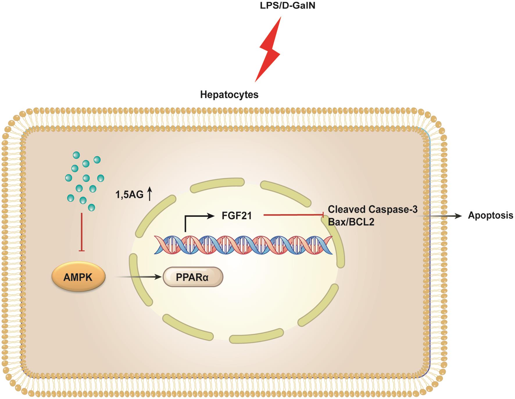 1,5AG exacerbated liver injury in ALF mice by inhibiting the hepatic PPARα pathway to promote hepatocyte apoptosis.