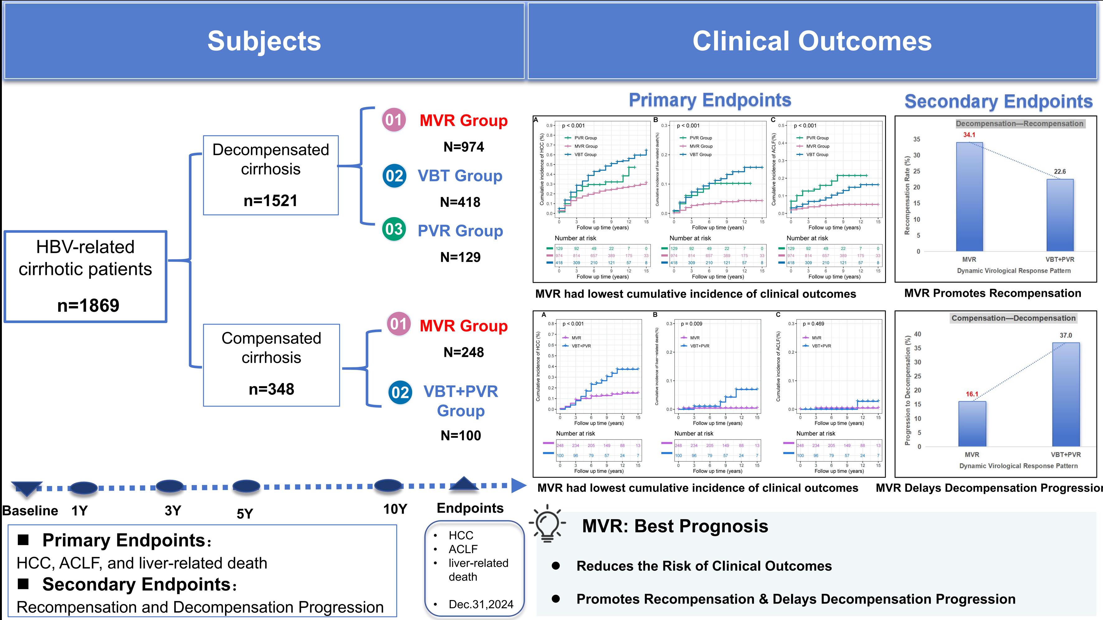 This large, real-world, 10-year cohort study demonstrated that MVR to NA therapy is strongly associated with a lower incidence of HCC and liver-related death and higher recompensation rates in patients with HBV-related cirrhosis. These findings collectively emphasize the critical importance of sustained virological suppression and the pursuit of HBV functional cure.