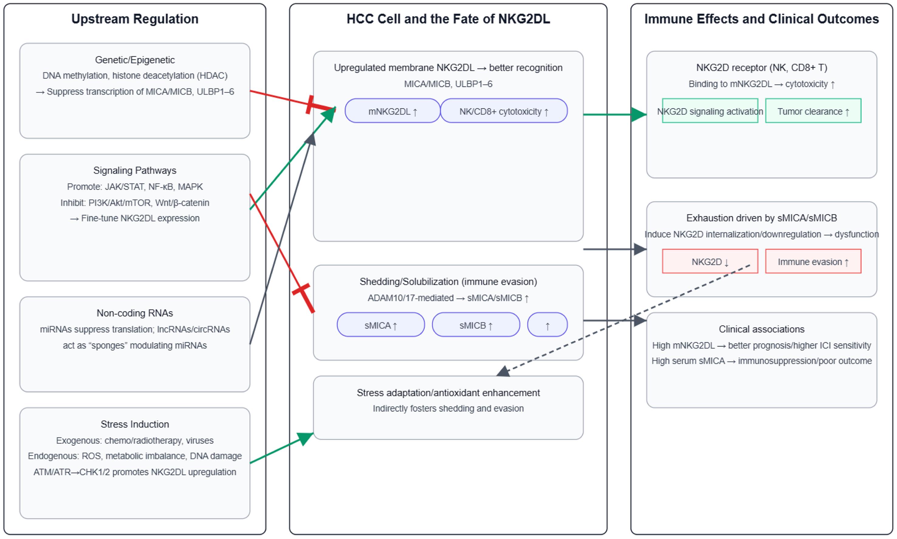 In-depth research on the regulatory effects of exogenous and endogenous stress factors on NKG2DL will help reveal how HCC regulates immune surveillance by modulating stress responses and provide new ideas for the development of novel anticancer therapies.